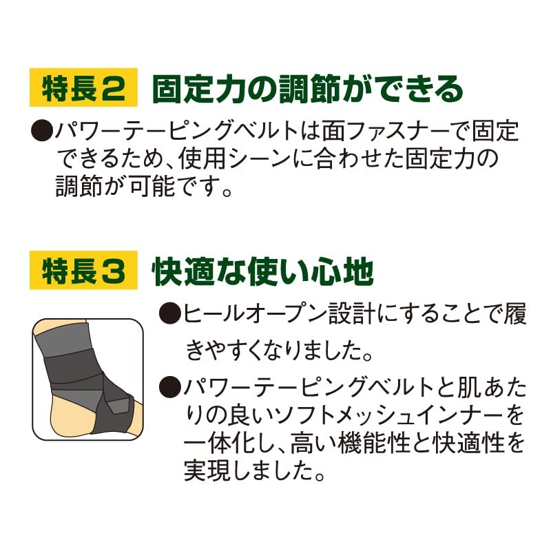 - 特殊技術に基づいたテーピング構造で、足くび全体をより強力にしっかりサポート