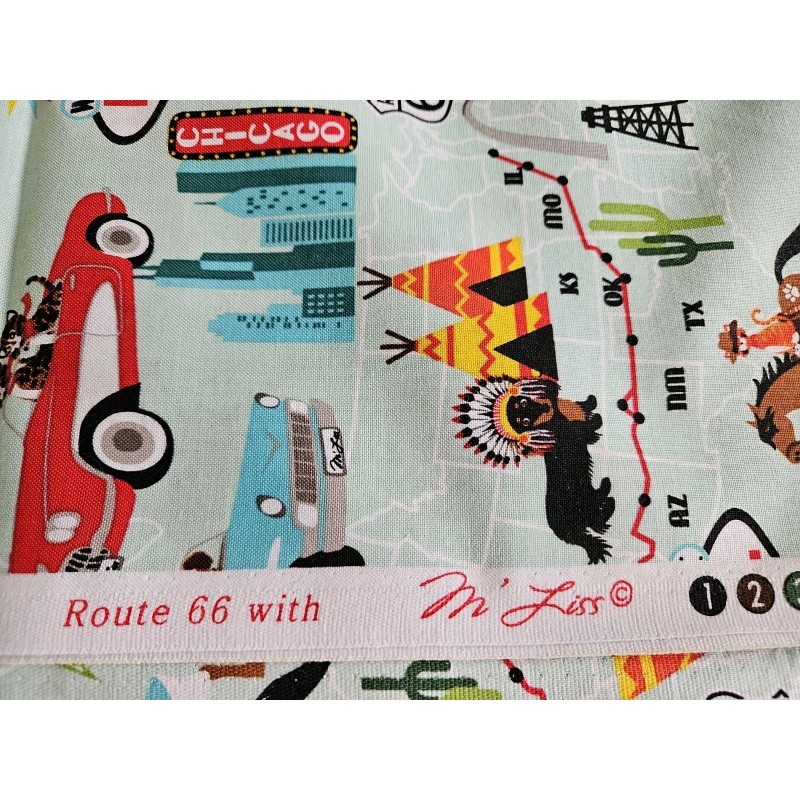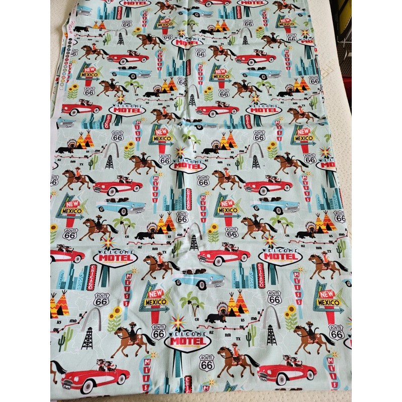 This beautiful new, 100% cotton fabric features a Route 66 pattern in multicolor with a light teal background.