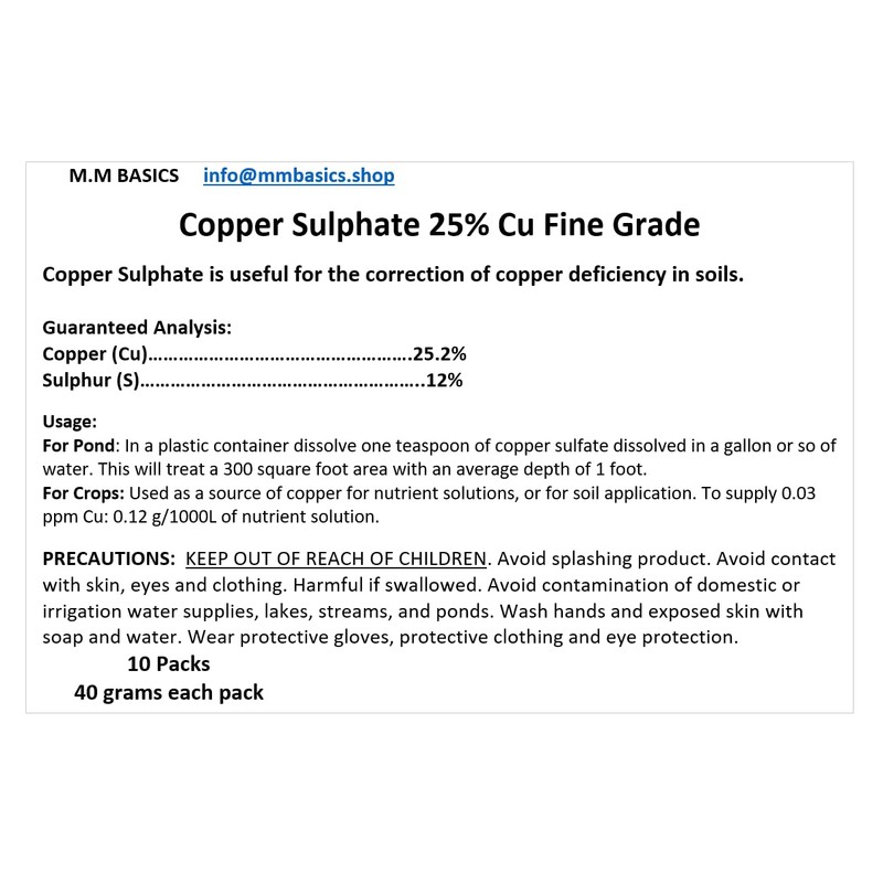 M.M BASICS Copper Sulphate Pentahydrate, 25% Cu Fine Grade, 40 Grams Each Pack (10 Packs)