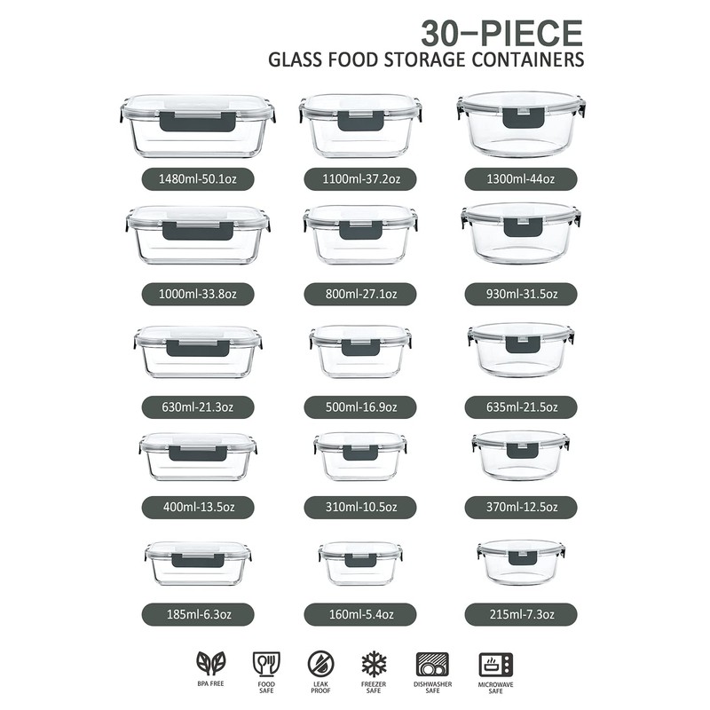 - 30-PIECE FOOD CONTAINER SET: 15 Containers with 15 lids with multiple sizes and shapes to fulfill your storage requirement. Package includes: 1 (50.1 oz), 1 (33.8 oz) 1 (21.3oz ) 1 (13.5oz )1 (6.3 oz) 1 (37.2 oz) 1 (27.1 oz) 1 (16.9 oz) 1 (10.5 oz) 1 (5.4 oz) 1 (44 oz), 1 (31.5 oz) 1 (21.5oz ) 1 (12.5oz )1 (7.3 oz) container with lids.