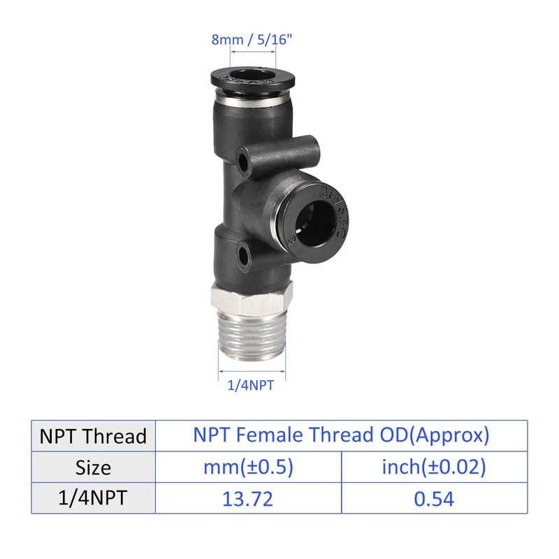 - Package contents: 1 package of 8 mm to 1/2 NPT connector, which total size is 54 mm x 29.5 mm x 15 mm/2.13 x 1.16 x 0.59 inches (L x W x H); external thread size is 1/2 NPT; double tube diameter is 8 mm / 5/16 inches; operating pressure is 0 to 1 MPa; operating pressure. temperature is 0 up to 60°C.