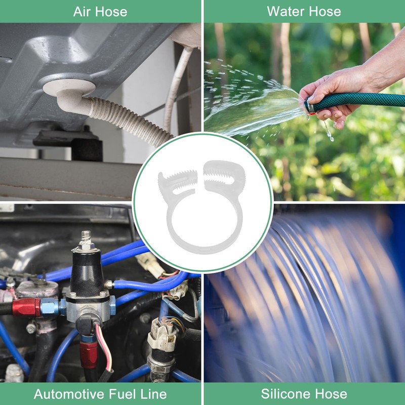 Great for securely fastening and sealing hoses, pipes, water lines, and fuel lines in automotive, home improvement, gardening, and plumbing applications, the nylon hose clamps have smooth edges that won't damage the pipes.
