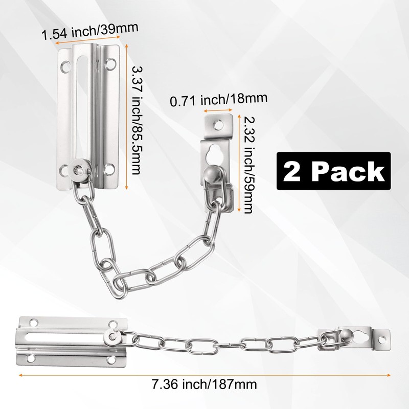 - [Size & Package] - This heavy duty door chain lock features a 9pcs-weld steel chain. Each package includes 2 locks (chain length: 187mm/7.36"; lock body: 86.5x37mm/3.4x1.5"). Requires standard fasteners for installation (Not included)