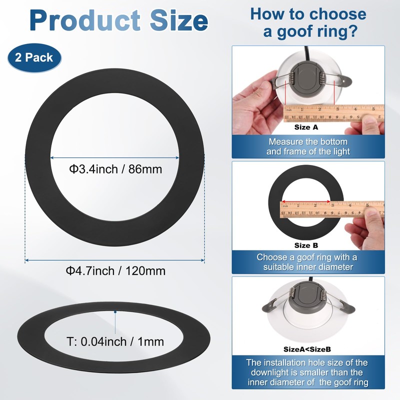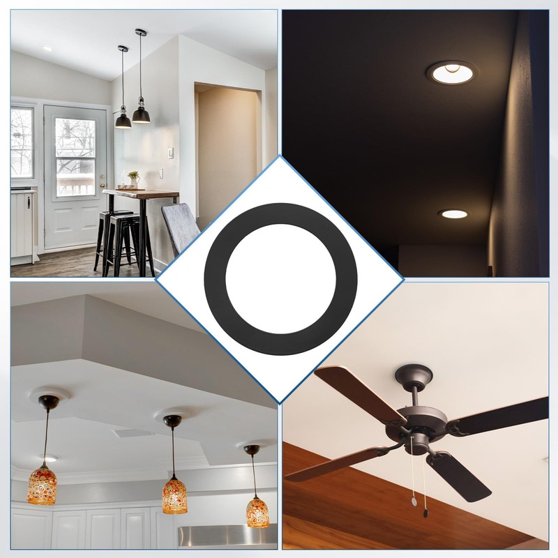 - [Size & Package] - This can lighting round downlight trim ring features a 120mm/4.7in outer diameter and 86mm/3.4in inner diameter with 1mm thickness, in black finish. Each package includes 2pcs trim rings, providing more complete coverage for recessed light installation