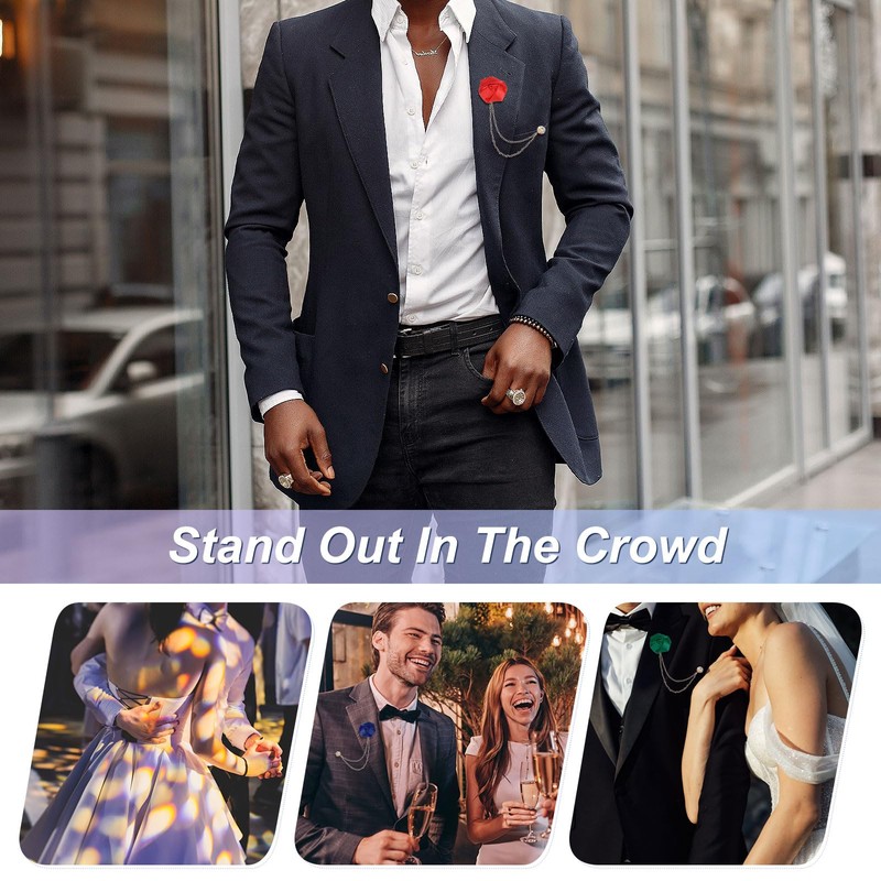 2. This rose lapel pin combines fabric flowers with a dangling chain for a sophisticated and elegant look. It can be securely fastened to a suit/blazer without the need for a tailor or other tools, and its lightweight design ensures comfortable all-day wear.