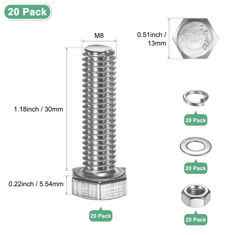 - [Size & Package] - Includes 20 sets of M8x30mm hex head screws bolt with matching nuts, flat washers, and lock washers, providing comprehensive fastening solutions