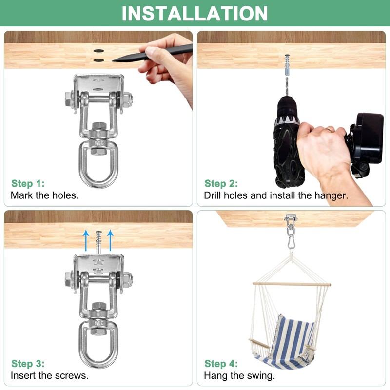 - [Multipurpose Use] - The swing hangers are designed for versatility, this kit is suitable for various applications including hammock chairs, trees, awnings, swings, porch swings, sandbag hangers, aerial yoga, and sling trainer. Effortlessly install this hammock chair hanging kit on ceilings in bedrooms, gardens, or any indoor/outdoor area