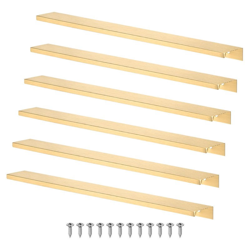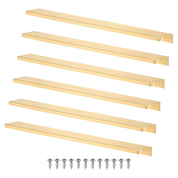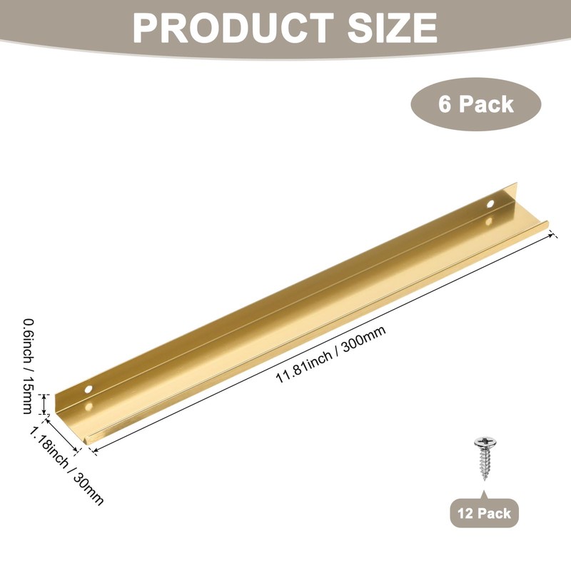 - [Size & Package] - Material: Aluminum; Color: Brushed Gold; Overall Size: 300mm x 30 mm x 15mm / 11.81" x 1.18" x 0.6"(L x W x H); Package Includes: 6Pcs x Cabinets Drawers Edge Pulls