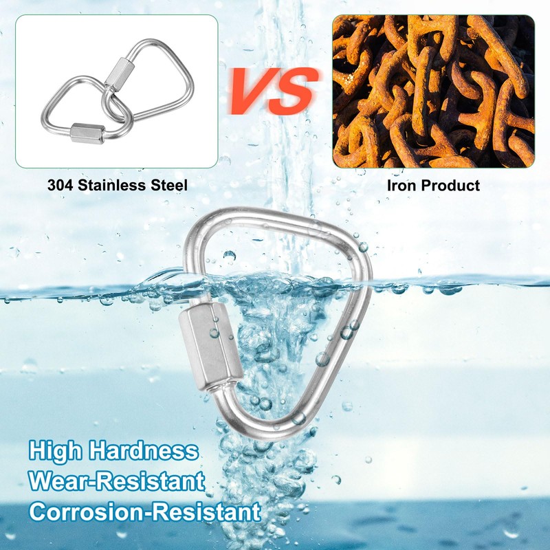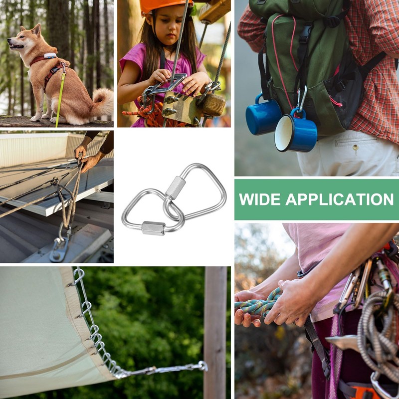 These quick links are perfect for daily life. It is suitable for chain links, swings, pet chains, shade sails, fitness equipment, DIY accessories, or hanging chandeliers. The chain connectors can also be used for outdoor activities such as camping, fishing, hiking, traveling, shade sails, etc.