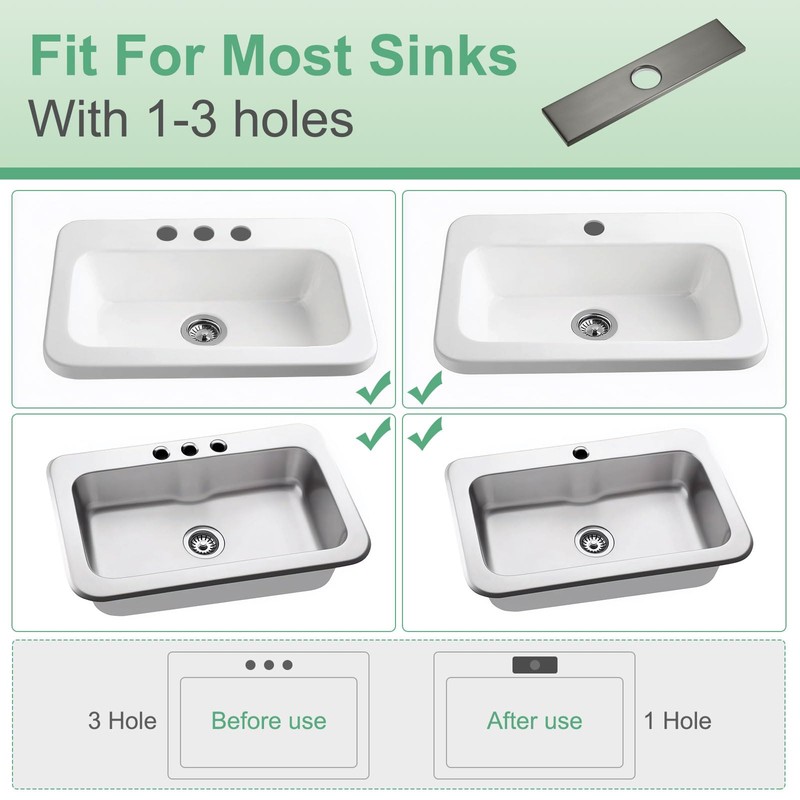 The faucet deck plate can match most kitchen/bathroom sinks and fit most single-hole kitchen sinks while allowing for single-hole mounting over 3-hole sinks, providing a neat look.