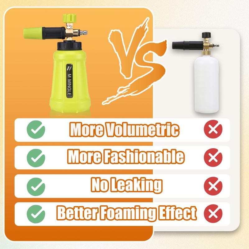 • Foam Cannon Car Wash Gun with Wide Neck: Designed to prevent cracking and facilitate easy pouring of soap liquid into the bottle. Simply connect the 1/4" quick connect plug to your handheld pressure washer. The heavy-duty foam core ensures denser and thicker foam. Container Capacity: 1 Liter / 0.22 Gallon. Maximum Pressure: 4000PSI, M22 14mm Fitting.