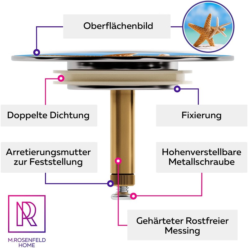 M. ROSENFELD HOME Bath Plug with Starfish Motif - Sea Star - 72 mm Universal Brass Bath Plug with Double Seal
