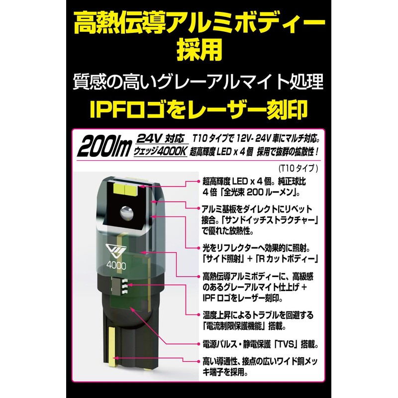 M's Basic by IPF Position Lamp, LED for Cars, T10, 200lm, 4000K, White, 12V 24V, 2-Pack, Compatible with Vehicle Inspection, Constant Current Circuit, Built-In Current Limiting Protection, Both Side
