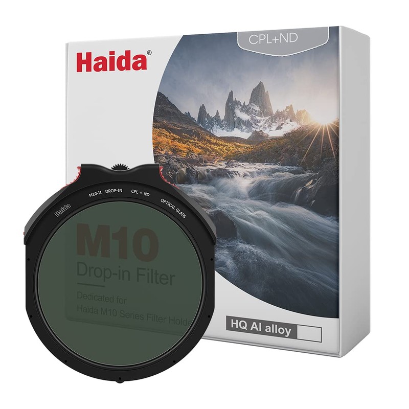 • This M10-II Drop-In 2-in-1 Circular Polarizer + Neutral Density ND 1.8 Filter from Haida combines a solid neutral density filter with a circular polarizer. It is mounted within a drop-in assembly that is made to fit the Haida M10-II Filter Holder. The geared filter ring assembly's external dial allows rotation of the circular polarizer filter to adjust the intensity of its effect.