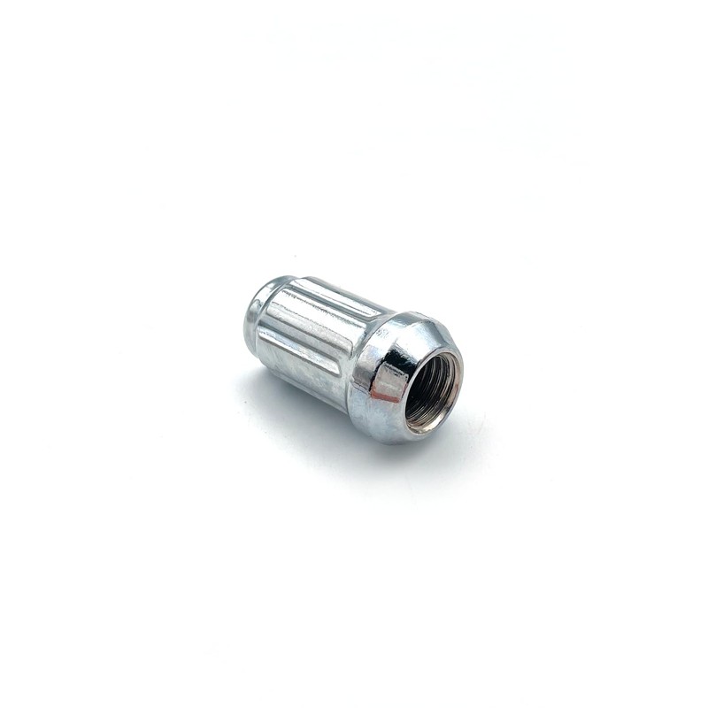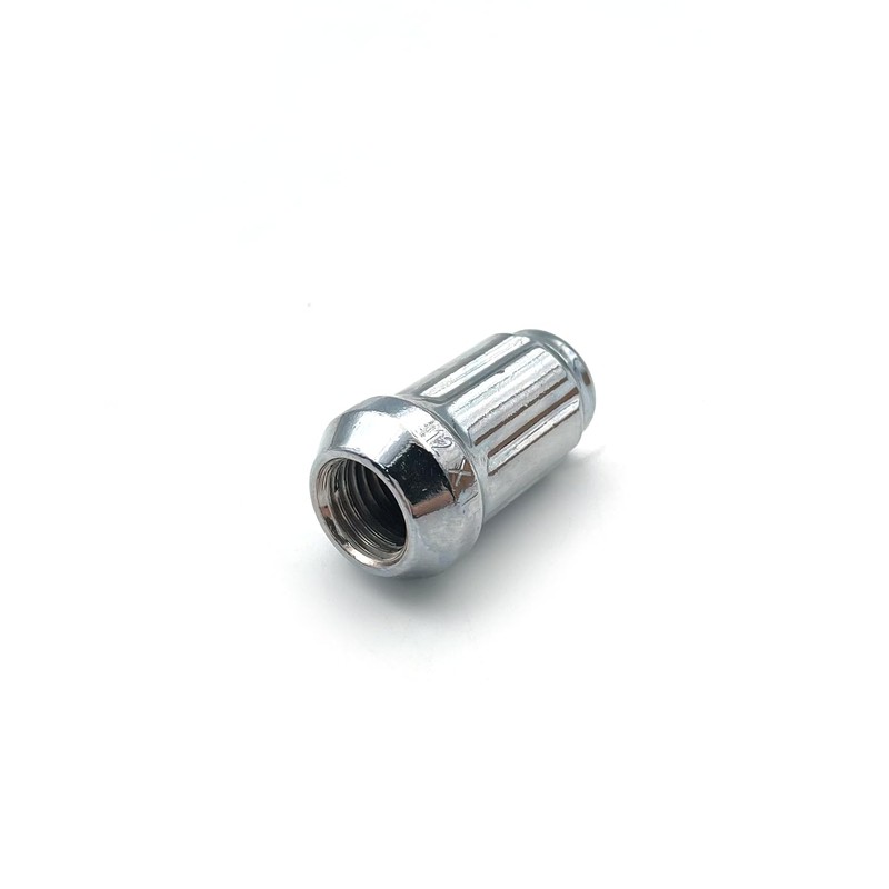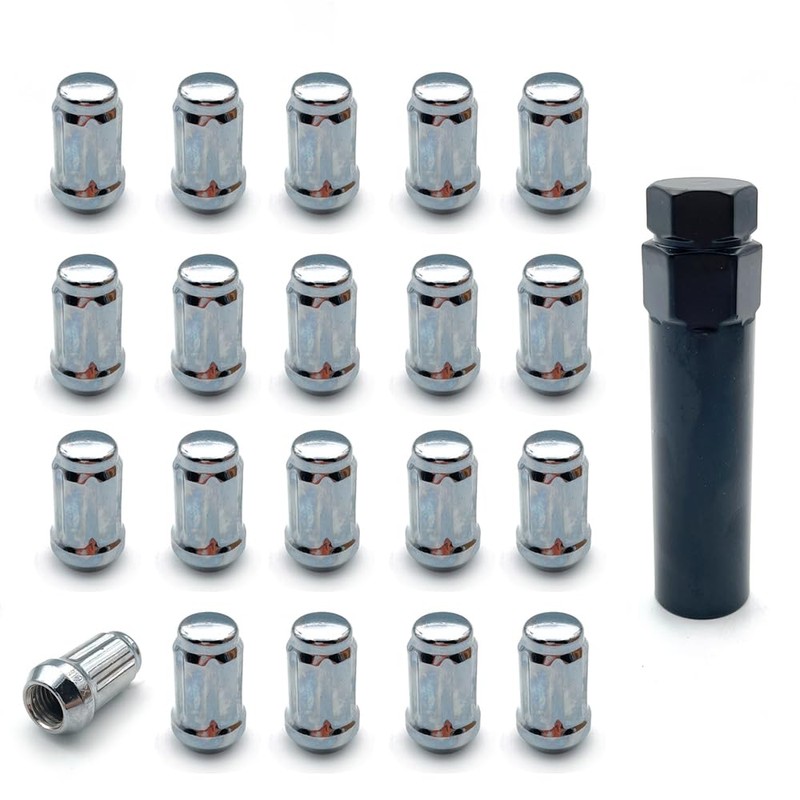 - SPECIFICATION - M12x1.5 thread - closed end bulge style lug nuts - conical 60 degree seat - 17mm hex - 35.05mm long - 20mm wide - color: silver / chrome. 20 pcs chrome close end lug nuts includes 1 socket key tool