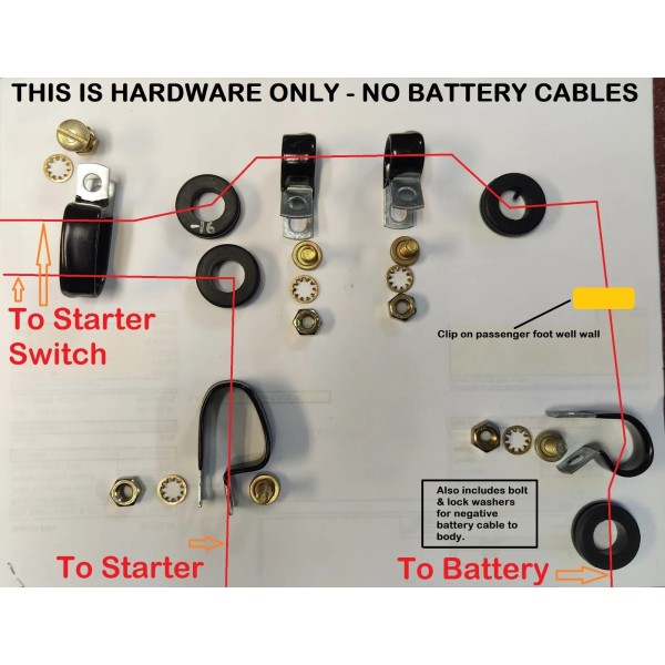 Comes with everything in first picture +..... Bolt and Internal & external lock washers for negative cable. Also retention clip in passenger footwell for Positive cable.