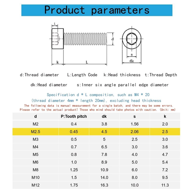 - Size:M2.5x16mm;Pitch:0.45;Package: 30 Pieces.