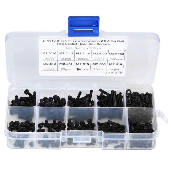 M2.5 Hex Socket Cap Bolts, 12.9 Degree Black Alloy Steel Socket Cap Screws 180 Pieces M2.5 X 3-20mm Hex Socket Cap Screws with 120pcs M2.5 Nuts
