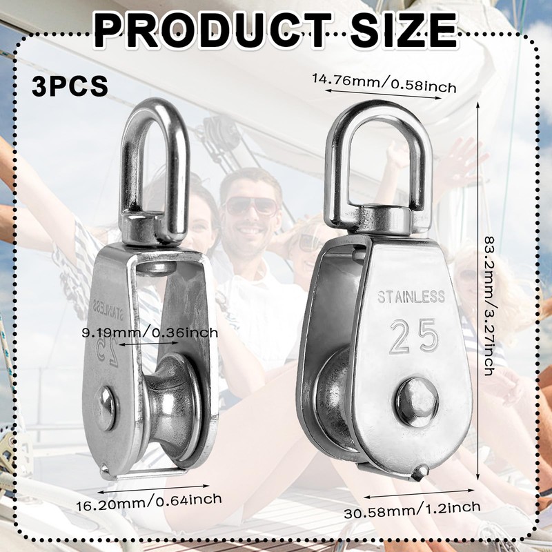 M25 Stainless Steel Single Pulley Block – 3-Pack 25mm Swivel Rope Pulleys, 150kg Load Capacity, 304 Steel Construction – Ideal for Lifting, Hoisting, and DIY Projects