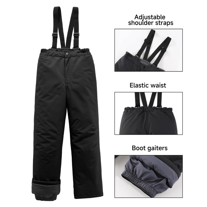 - Snow Pants: Features adjustable shoulder straps and elastic ankle ribbon, which could fit over boots well.