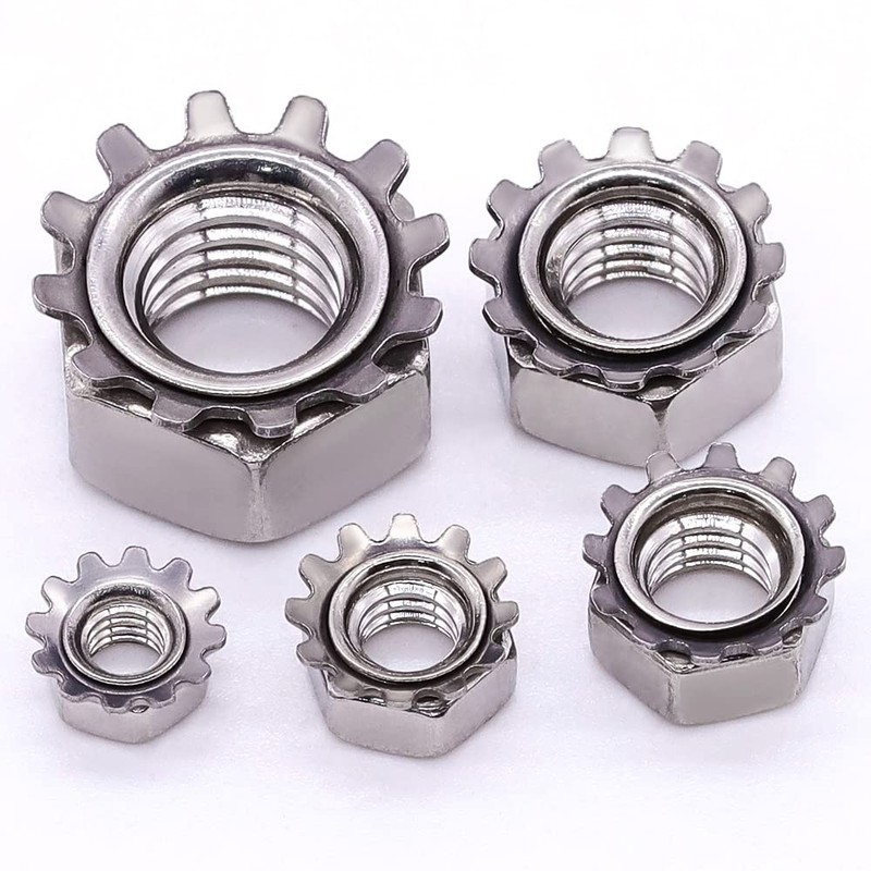 - Feature: K-Lock Nuts feature a built in external tooth lock washer that is easily spinning, The teeth on the lock washer can bite into the surface and help lock the nut into place.