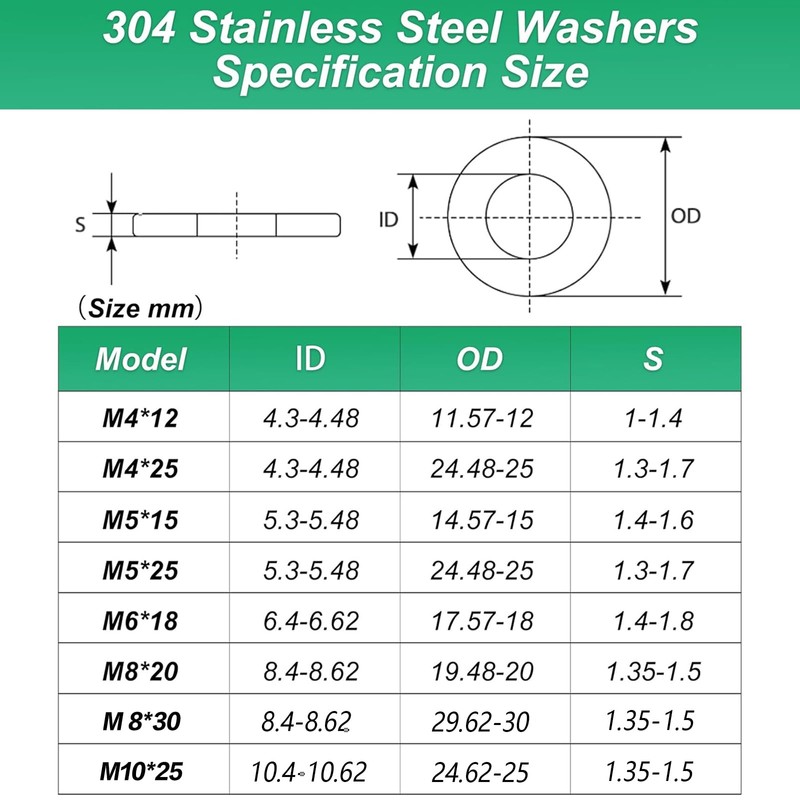 - Prevent loosening: M4 25 mm stainless steel washers provide a flat, load-bearing surface that effectively distributes the pressure generated by the fasteners by increasing the contact surface and preventing loosening of the fastening connections.