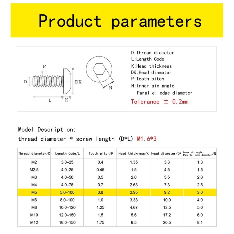 - Thread Diameter 5mm; Thread Pitch: 0.8mm; Screw Length: 20mm.