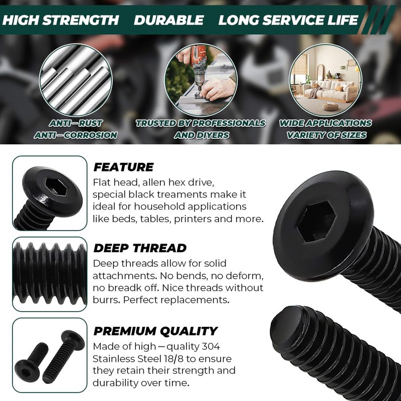 - Material: The screws are made of 304 stainless steel 18/8; Excellent toughness; Good corrosion resistance; Extra Black Oxide treatments make it more chemical resistance