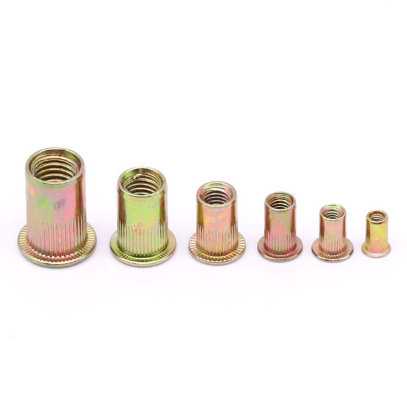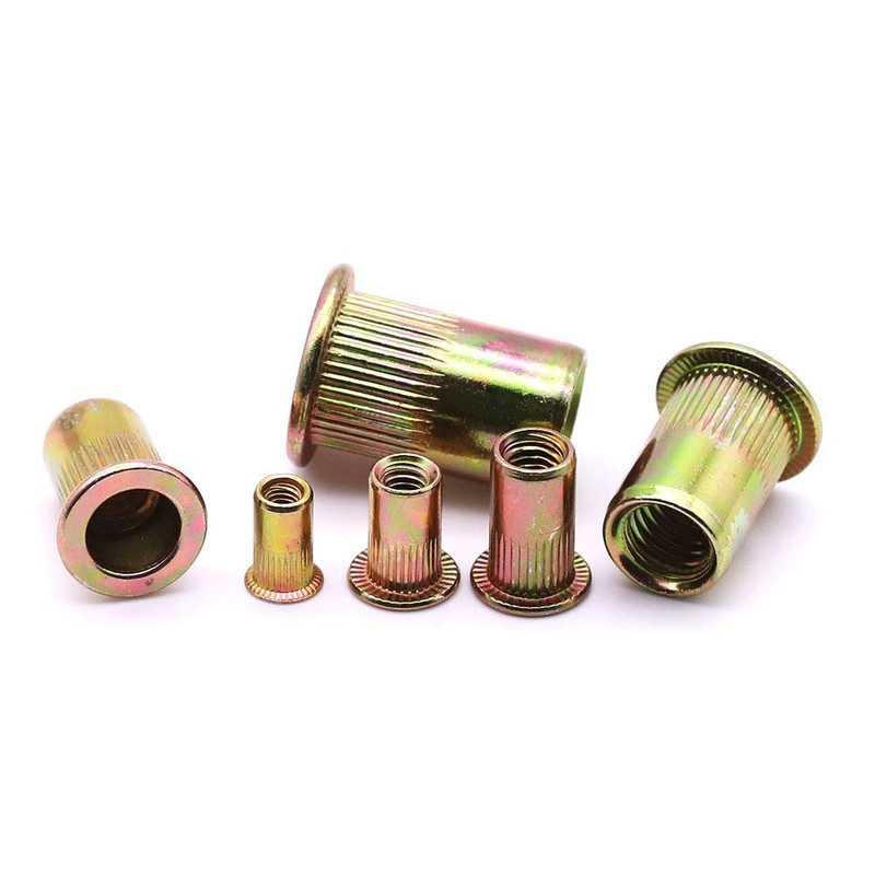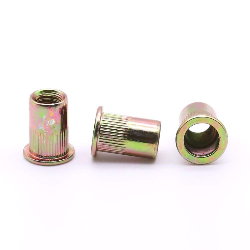 M6 Carbon Steel Rivet Nut Rivnut, Flat Head Threaded Rivetnut Insert, Yellow Zinc Plated Finish, Knurled Body, Pack of 50