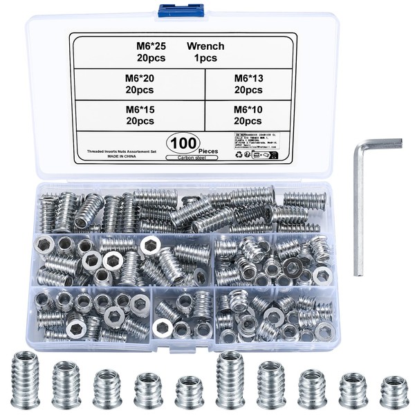 - 【M6 Threaded Insert Nuts Set】Suitable for use with various materials such as steel, pine, plywood, composite panels, etc. It plays an important role in the connection, installation and fixation of furniture, and can be used for cabinets, sofas, beds, cabinets, chairs, etc. furniture.