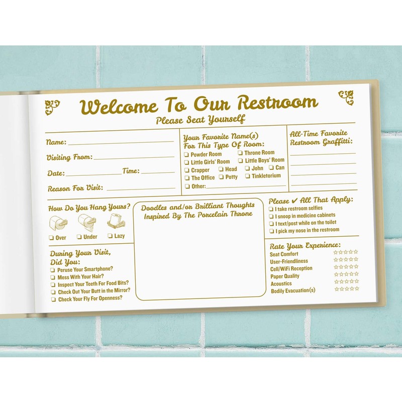 - 112 HILARIOUS PAGES - Each page includes hilarious checkboxes including ‘favorite name of bathroom’, ‘rate your experience’, ‘how does yours hang’ and ‘check all that apply’. There is even a doodle spot to let guests really surprise you!