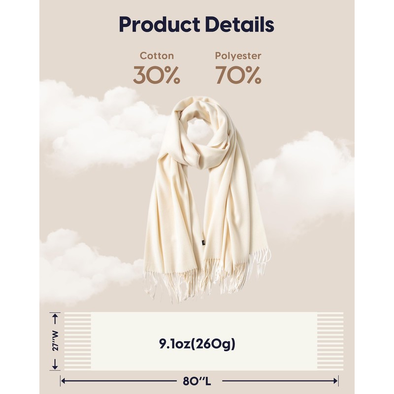 - 【Softness】This scarf is large, warm, lightweight and soft, feels like cashmere. 80" long (74" + 3" tassels on each side), 27" wide, and weighs 9.1 oz. Still soft after many washes.