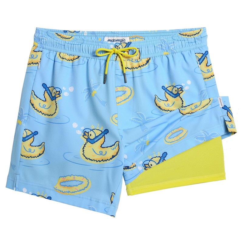 MaaMgic Mens Swim Trunks with Compression Liner 2 in 1 Swimming Shorts Stretch 5.5" Quick Dry Bathing Suits,Ducks Blue,Medium