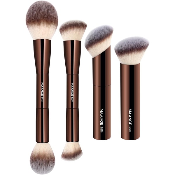 MAANGE 4 PCS Makeup Brush Set, Double-ended Kabuki Brush Contour Brush for Liquid Powder Conceale Blending Blush Buffing Face Makeup Tools (Coffee)
