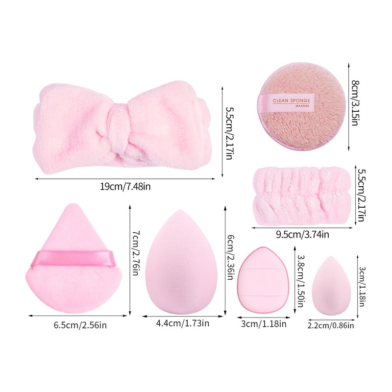 1.FOR ALL KINDS OF COSMETICS:8 pcs powder puffs, 8 pcs beauty blender sponge, 1 pcs clean sponge, 1pcs headband and 2 pcs wristband.