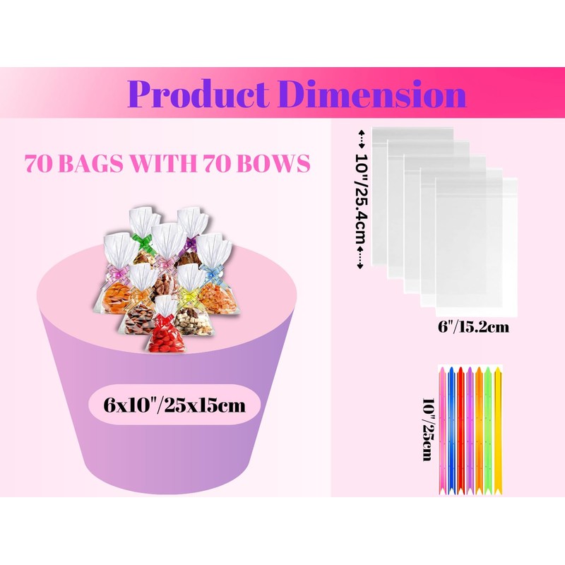 - PACKAGE INFO :Our biodegradable cellophane bags come in a pack of 70 (6” (w)x 10” (H)” ) with 2 inch gusseted bag and 70 bows(10x0.04 inches) which make them a versatile packaging option for wide range of products. They are perfect for displaying sweets WHILST enhancing the overall packaging