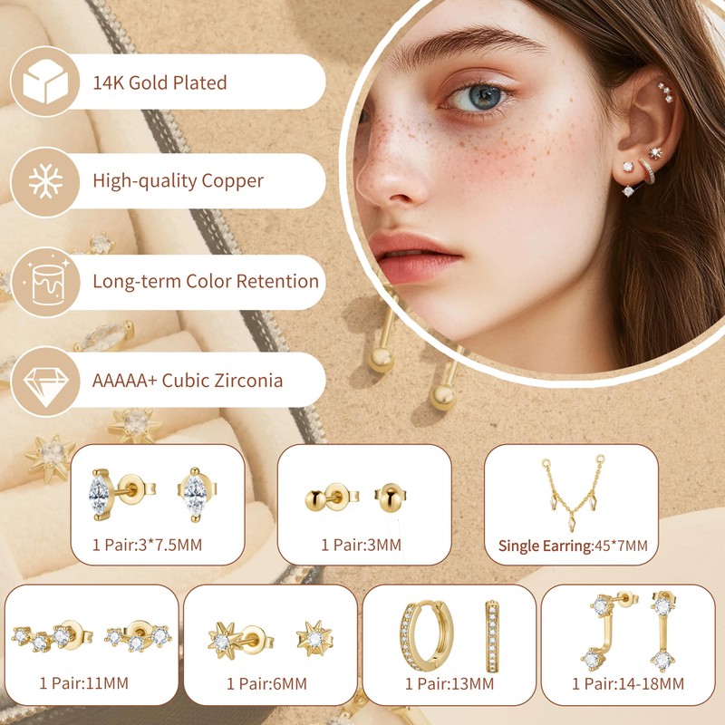 - ✨ 13-Piece Gold Earrings Set by Macachii✨This versatile set includes 6 pairs of gold earrings plus 1 stylish chain drop earring—featuring studs, hoops, ball styles and CZ details. Ideal for stacking and mixing across multiple piercings, from earlobe to cartilage