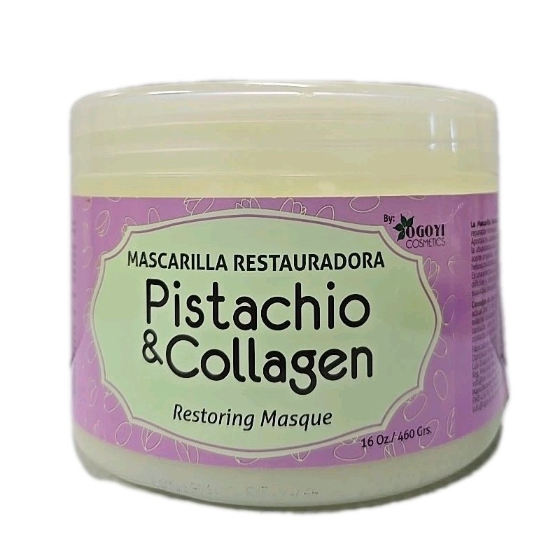 Pistachio And Collagen Restoring Hair Masque 16 Oz. Salon quality collagen hair mask. Treats the hair. Hair retains moisture and softness.