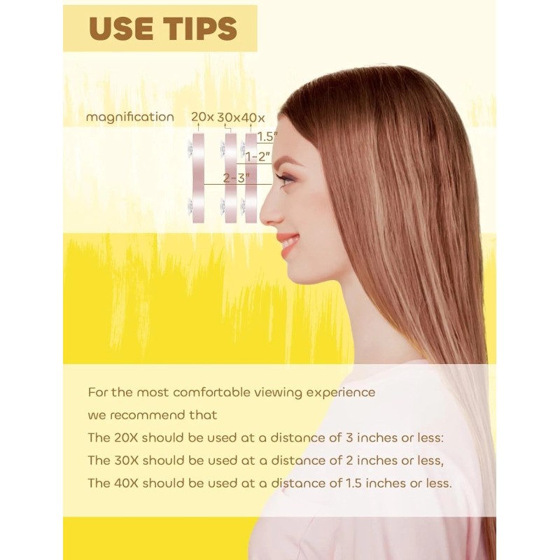 - Each magnification has specific distance requirements for use: the 20x mirror should be used within 3 inches; the 30x requires a distance of 2 inches; and the 40x must be used at an extremely close proximity of 1.5 inches