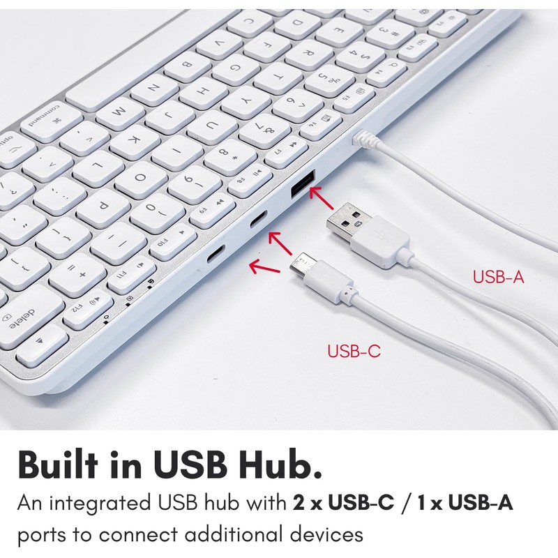 - 𝟯 𝗣𝗼𝗿𝘁 𝗨𝗦𝗕 𝗛𝘂𝗯: Connect up to 3 peripherals like a mouse and hard drive directly into our small Apple wired keyboard. It has an additional 2x USB-C ports and 1x USB-A port.