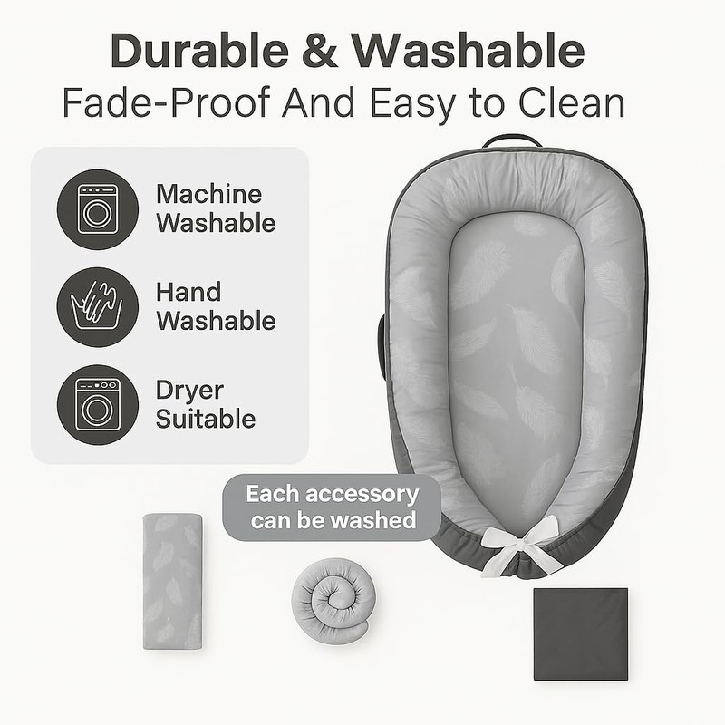 - ๐ ๐ฎ๐ฐ๐ต๐ถ๐ป๐ฒ ๐ช๐ฎ๐๐ต๐ฎ๐ฏ๐น๐ฒ & ๐๐ฒ๐๐ฎ๐ฐ๐ต๐ฎ๐ฏ๐น๐ฒ ๐๐ผ๐๐ฒ๐ฟ: Keeping your babyโs nest clean is effortless! The removable cover is designed for quick and easy detachment, allowing you to simply unzip and toss it in the washing machine.