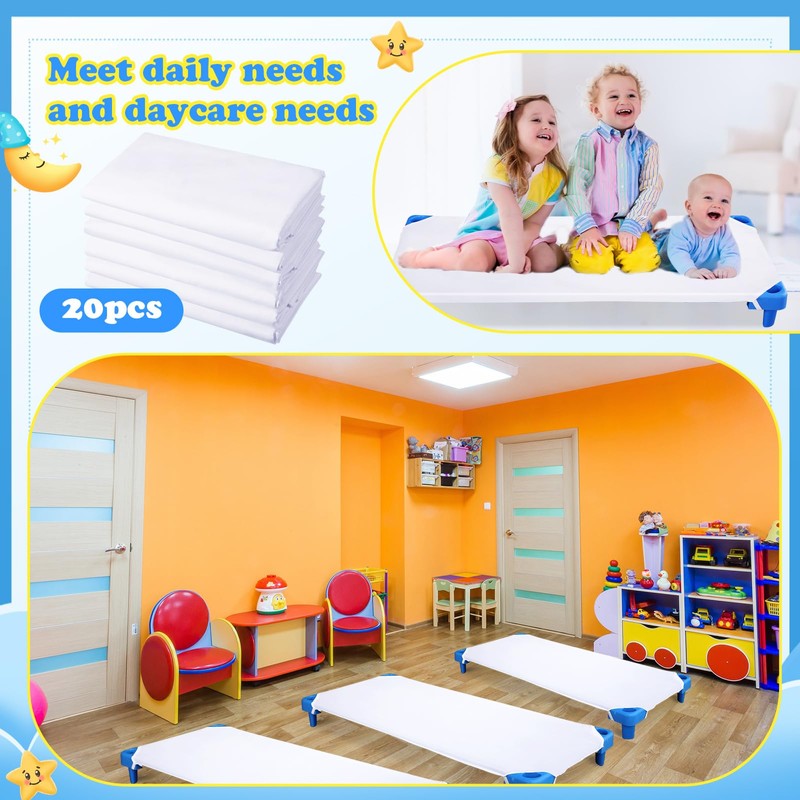 - Bulk Convenience: never be without a fresh sheet again; With a generous set of 20 pieces, daycares and preschools can always have a clean cot sheet on hand, streamlining naptime preparations and post nap cleanups