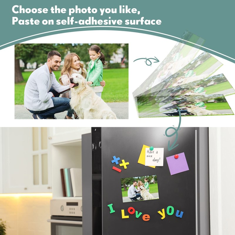 - Simple Steps: magnetic sheet is easy to use, one side is a magnet, and the other side is glue, you just tear off the protective paper at the back, paste the sheet onto cards, pictures, or photos, and then attach the magnet side onto the metal surface, simple and fast