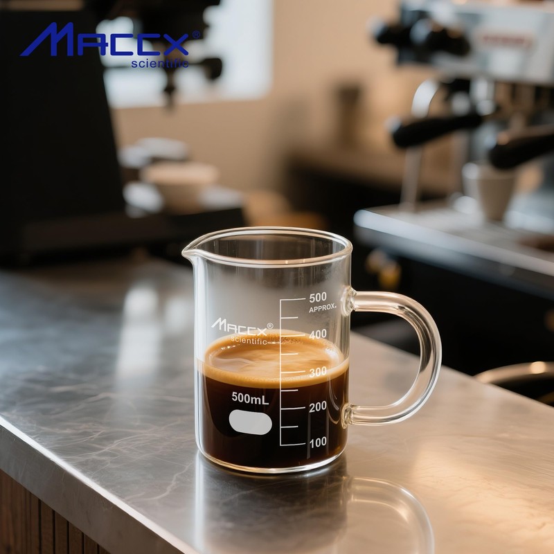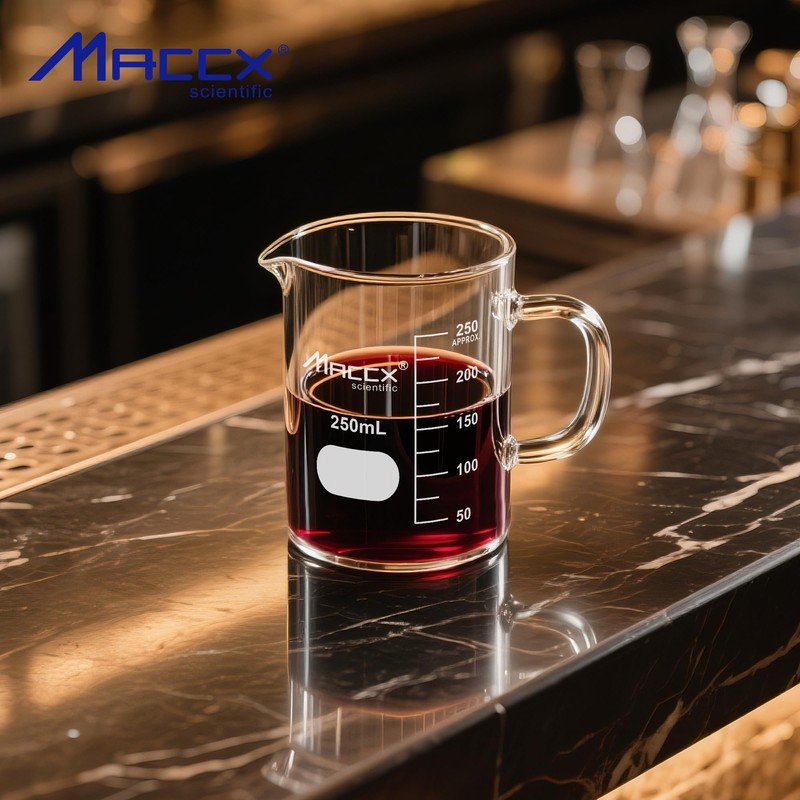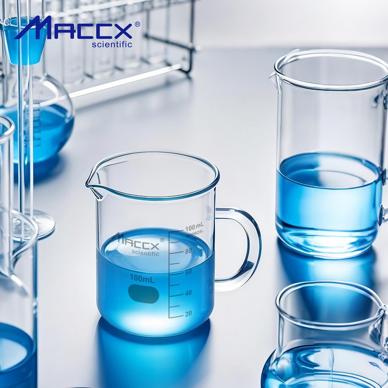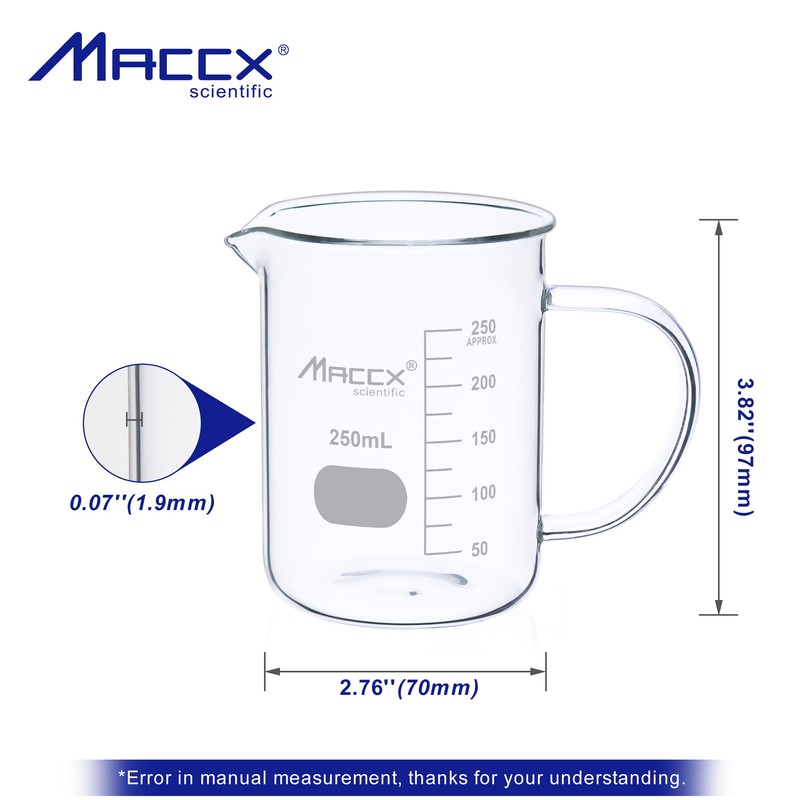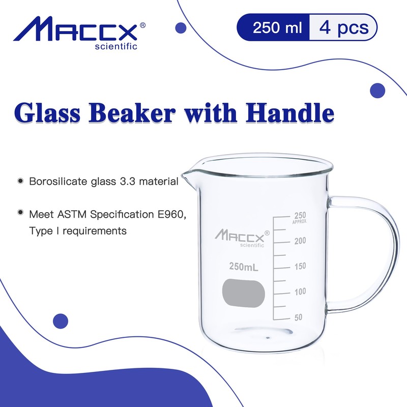 Maccx Glass Beaker with Handle, Vol. 250ml, Griffin Low Form with Printed Graduation,Pack of 4, BKLH250-004