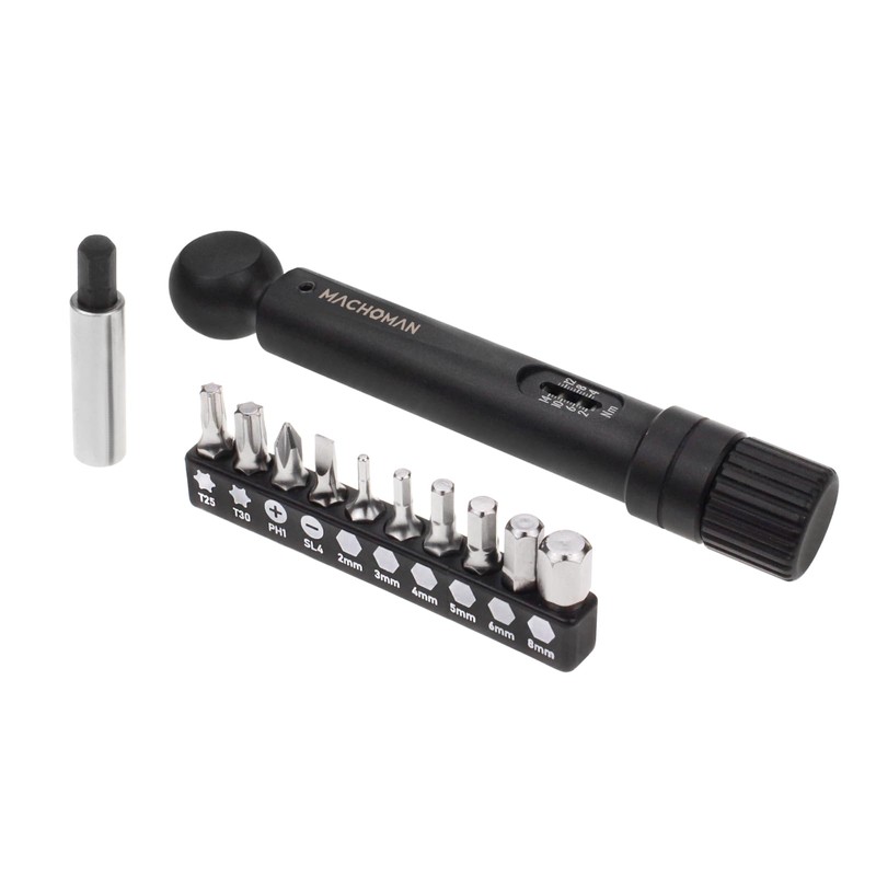 - Macho torque wrench 1/4 inch with 2-14 Nm, drive: 1/4 inch, length: 5.5 inch, 10 1/4 inch bits: PH1, SL4, T25, T30, H2, H3, H4, H5, H6, H8 and a bit holder