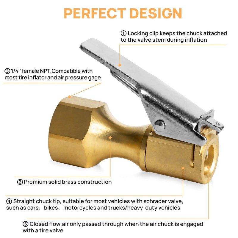 - Versatile Straight Chuck Tip - Our heavy-duty brass tire chucks feature a straight chuck tip that is suitable for most vehicles with a schrader valve, including cars, motorcycles, and trucks/heavy-duty vehicles (may be less effective on bikes).