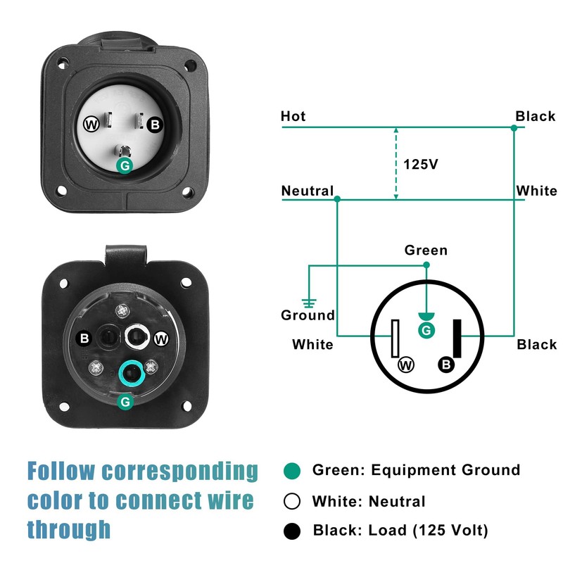 - [Safety Gauge Guide] 15Amp AC port plug - NEMA 5-15P 15 Amp flanged inlet uses 16AWG, 14AWG, or 12AWG wire( Max). Cable color scheme: Black - Load(125 Volt), White - Neutral, Green - Equipment ground. You can define the Length and Diameter of the cord based on actual need and actual AWG. Do not use smaller gauge for may cause overheating or other issue.
