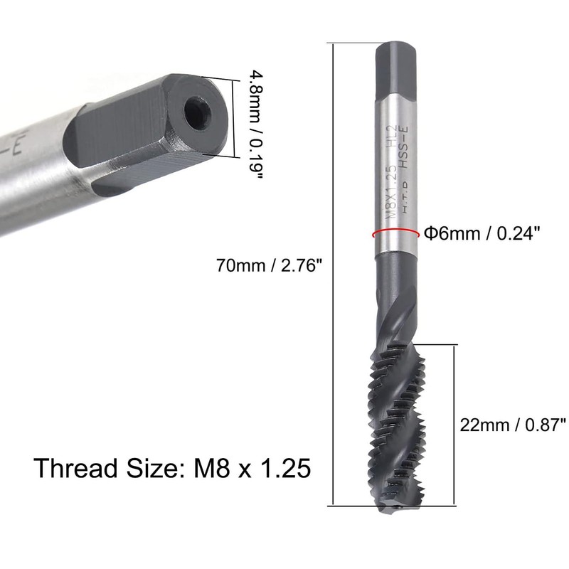 - Tap Size: M8 x 1.25 thread, H2 tolerance. Spiral flute design, upward chip removal. Right hand thread cutting, clear threads without burrs, fast tapping with accuracy.