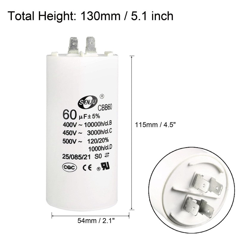 - [Specification]: Rated Capacity: 60uF; Tolerance: ±5%; Rated Voltage: 450V AC; Body Size: 115x54mm ; Rated Frequency: 50/60Hz; Climatic Category: 25/085/21