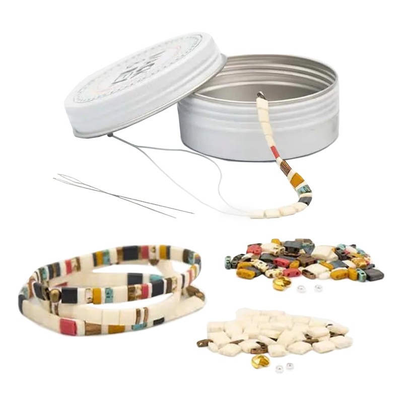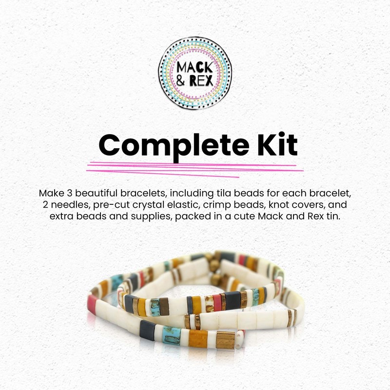 - Complete Kit: Make 3 beautiful bracelets, including tila beads for each bracelet, 2 needles, pre-cut crystal elastic, crimp beads, knot covers, and extra beads and supplies, packed in a cute Mack and Rex tin.
